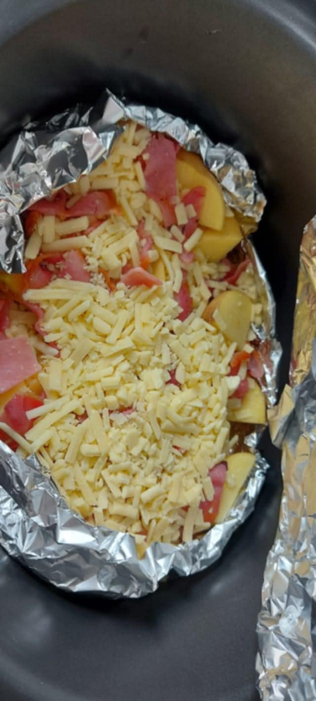 Place potatoes to cover the bottom, chopped onion on top with some bacon, cheese and abit of garlic, place the rest of the potatoes on top with the chopped onion, garlic, bacon and cheese. I’ve put on high for 4 hours. Will check if potatoes are soft and judge it from there (baring in mind it’s my first time doing this)
